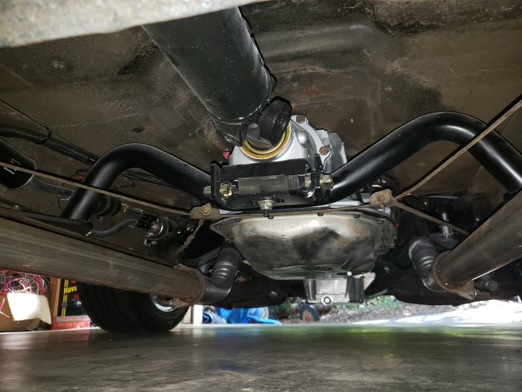 Transmission installed with new front and rear seals, filter and pan gasket, internal wiring harness, slip yoke conversion, shortened drive shaft, Dirty Dingo cross member and new transmission mount